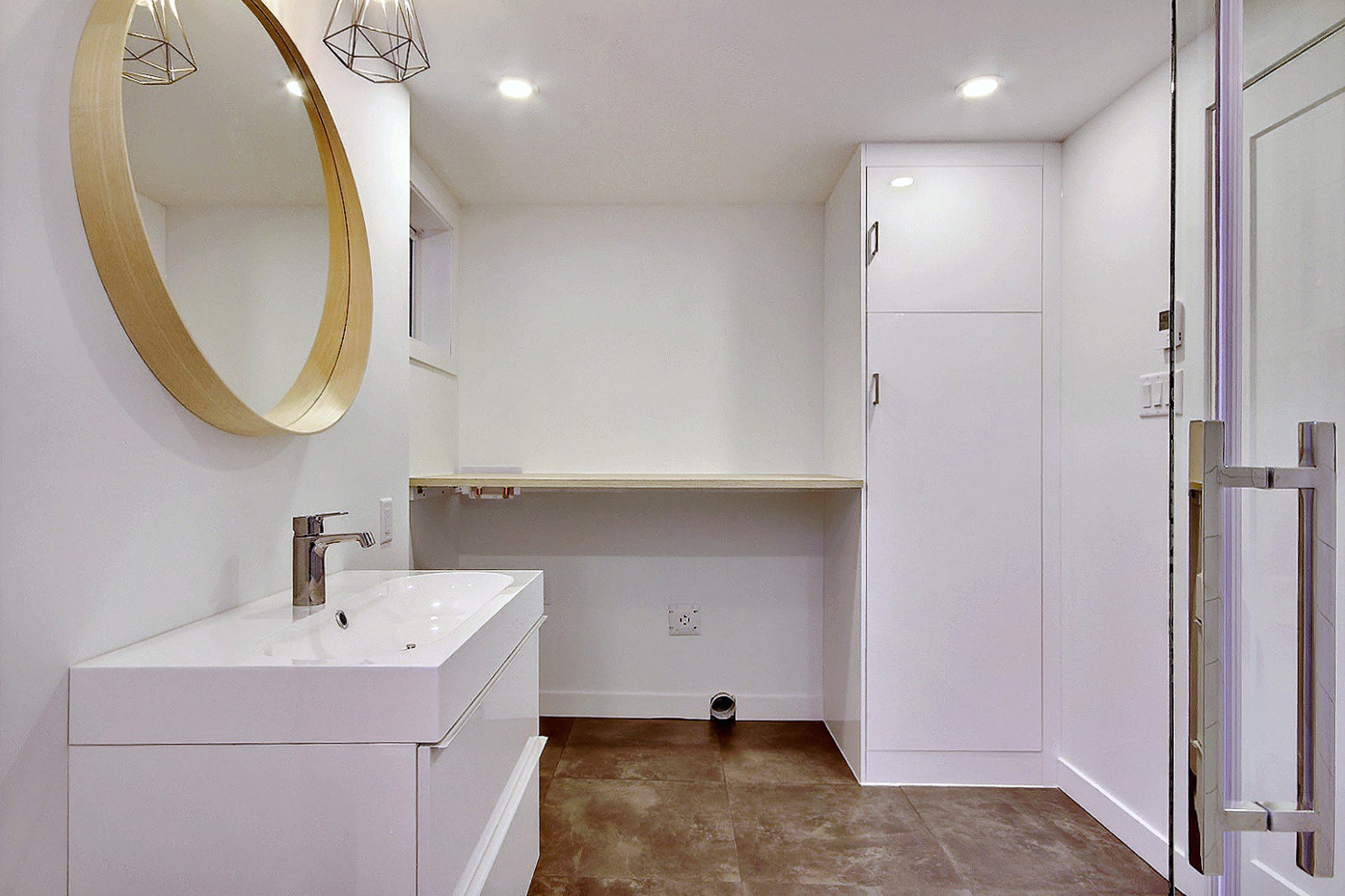 de la cuisine et des salles de bain. Le comptoir de la cuisine est en béton microtopping. Le revêtement